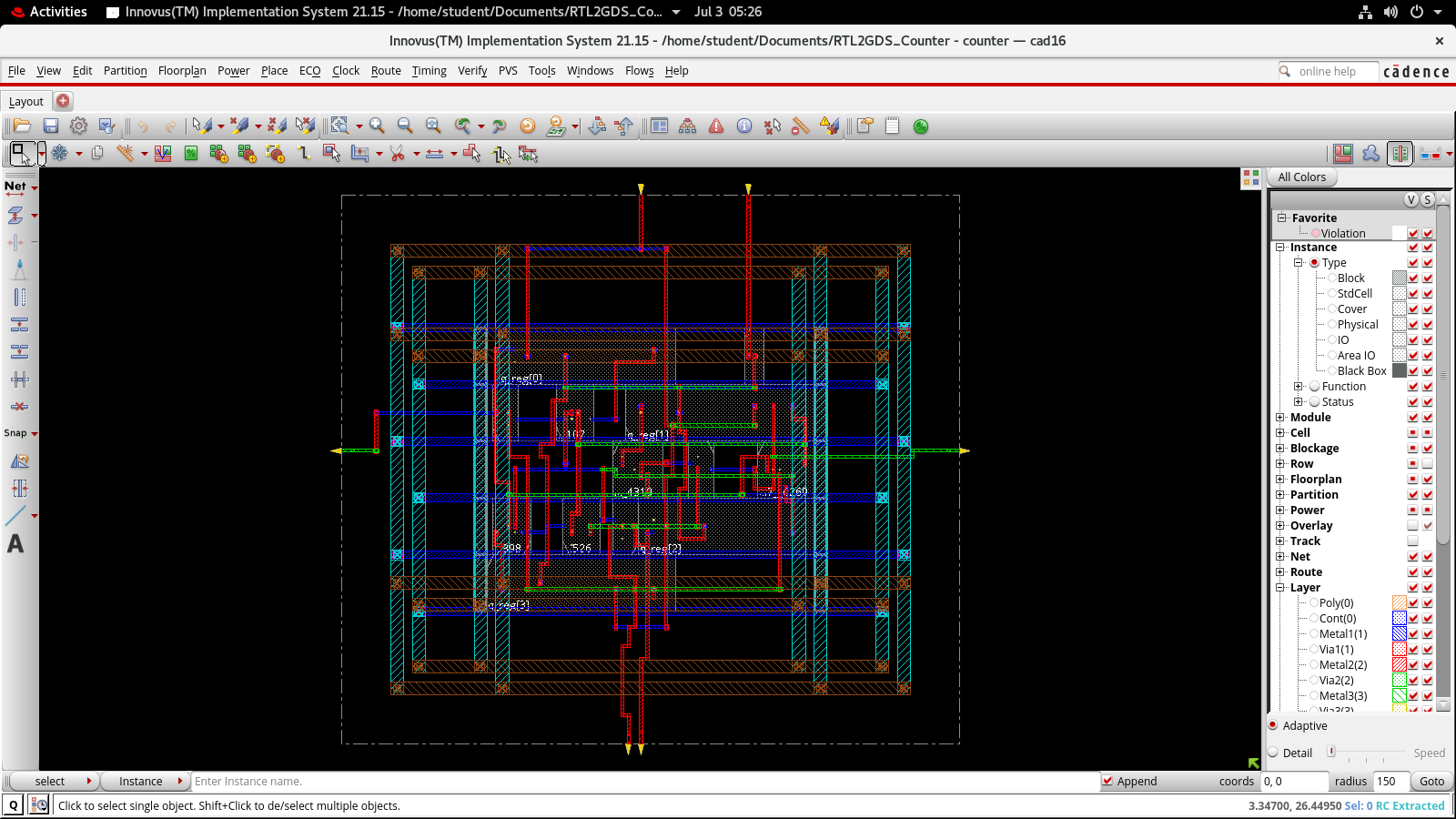 Counter was designed using verilog, Incisive was used for functional simulation, Genus was used for synthesis of the design and Innovus was used for floor planning, power planning, routing, timing and GDSII file extraction.
